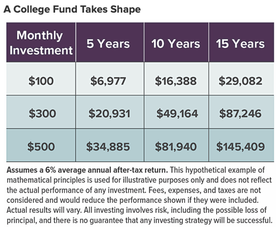 Setting aside money for college over many years takes discipline, and in many cases sacrifice, including lifestyle changes. Every family's situation is different. But if you save regularly over time, you might be surprised at how much you could accumulate in your college fund.