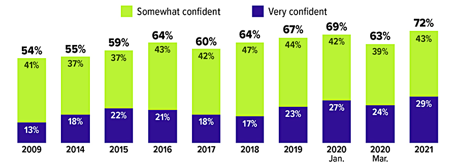 In January 2021, more than seven out of 10 workers were very or somewhat confident that they would have enough money to live comfortably throughout their retirement years. This was the highest confidence level since 2000 and a significant rebound from levels in March 2020 after the pandemic began. Overall, retirement confidence has trended upward since the Great Recession.