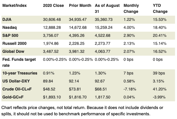 The benchmark indexes enjoyed a solid August, with the S&P 500 and the Nasdaq reaching record highs multiple times during the month. In fact, the S&P 500 recorded its seventh straight monthly advance — its longest streak of monthly gains since January 2018. Each of the benchmarks is well ahead of its 2020 year-end value, led by the S&P 500, followed by the Nasdaq, the Global Dow, the Dow, and the Russell 2000. Ten-year Treasury yields increased and crude oil prices fell, while the dollar and gold prices inched higher.