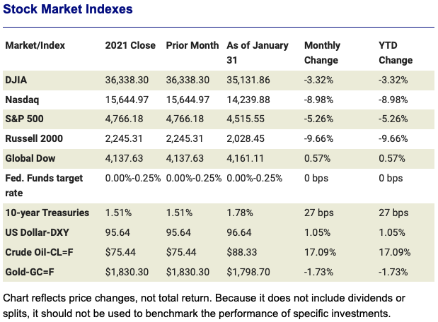 A late rally wasn't enough to prevent the major benchmark indexes from closing out one of the worst months since March 2020. Only the Global Dow was able to eke out a January gain. An end-of-month rally helped the Nasdaq avert the sharpest January decline on record. Nevertheless, tech stocks were hit hard in January as investors pondered how rising interest rates might weigh on that sector's pricey valuations. The small caps of the Russell 2000 dropped more than 9.5%, while the large caps of the S&P 500 (-5.3%) and the Dow (-3.3%) slid lower.
