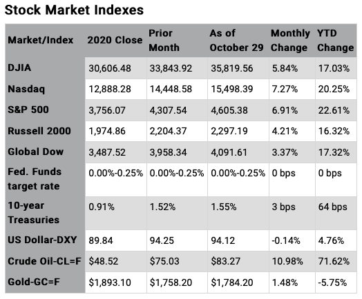 October proved to be one of the best months for equities in 2021, with each of the benchmark indexes listed here enjoying solid gains. The S&P 500 had its best month since November 2020. The Nasdaq picked up over 7.25%, the largest monthly advance in more than a year. Strong third-quarter corporate earnings data helped ease investor concerns that rising inflation, supply-chain bottlenecks, labor shortages, and rising coronavirus cases would hamper corporate America. Year to date, each of the indexes is well over 16.00% higher than its respective 2020 closing value, with the S&P 500 and the Nasdaq more than 20.00% higher.