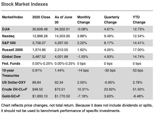 Overall, the second quarter was a good one for equities. The Nasdaq gained 9.5%, followed closely by the S&P 500 (8.2%), the Global Dow (4.9%), the Dow (4.6%), and the Russell 2000 (4.1%). Real estate, information technology, energy, and communication services all posted quarterly gains of more than 10.0% to lead the market sectors. Year to date, the Russell 2000 is well ahead of its 2020 year-end closing value, followed by the Global Dow, the S&P 500, the Dow, and the Nasdaq.