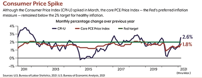 Based on the core numbers, inflation is not yet running high, but there are clear inflationary pressures on the U.S. economy. Loose monetary policies by the central bank and trillions of dollars in government stimulus could create excess money supply as the economy reopens. Pent-up consumer demand for goods and services is likely to rise quickly, fueled by stimulus payments and healthy savings accounts built by those who worked through the pandemic with little opportunity to spend their earnings. Businesses that shut down or cut back when the economy was closed may not be able to ramp up quickly enough to meet demand. Supply-chain disruptions and higher costs for raw materials, transportation, and labor have already led some businesses to raise prices.7