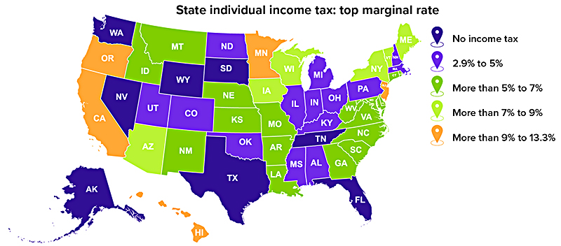 Eight states have no state income tax. Of the 42 states with a state income tax (and the District of Columbia), the top marginal income tax rate ranges from 2.9% to 13.3%. Most states (and D.C.) with an income tax have multiple tax brackets with graduated rates; nine states have only a single tax rate.